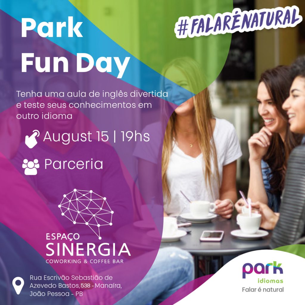 O Espaço Sinergia Coworking Coffee & Bar vai sediar nesta quinta-feira (15), às 19h, em parceria com a Park Idiomas, o Park Fun Day. Os participantes poderão ter uma aula de inglês divertida e testar os conhecimentos em outro idioma. As vagas são limitadas e as inscrições podem ser feitas pelo link: https://forms.gle/y24oLtoZwggAPs2X6
