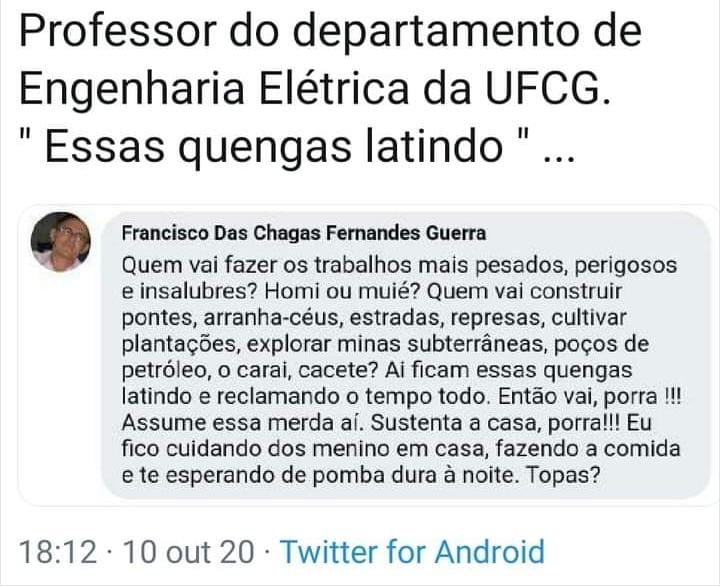 ‘ESSAS QUENGAS LATINDO’: Professor da UFCG critica mulheres que trabalham fora de casa e é repudiado por reitoria