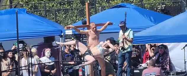 Na cena, um homem aparece crucificado em cima de um palco. Em seguida, chega uma pessoa com shorts jeans curto, top brilhante e salto alto que começa a dançar de maneira sexual na cruz. A performance, depois, continua no chão.