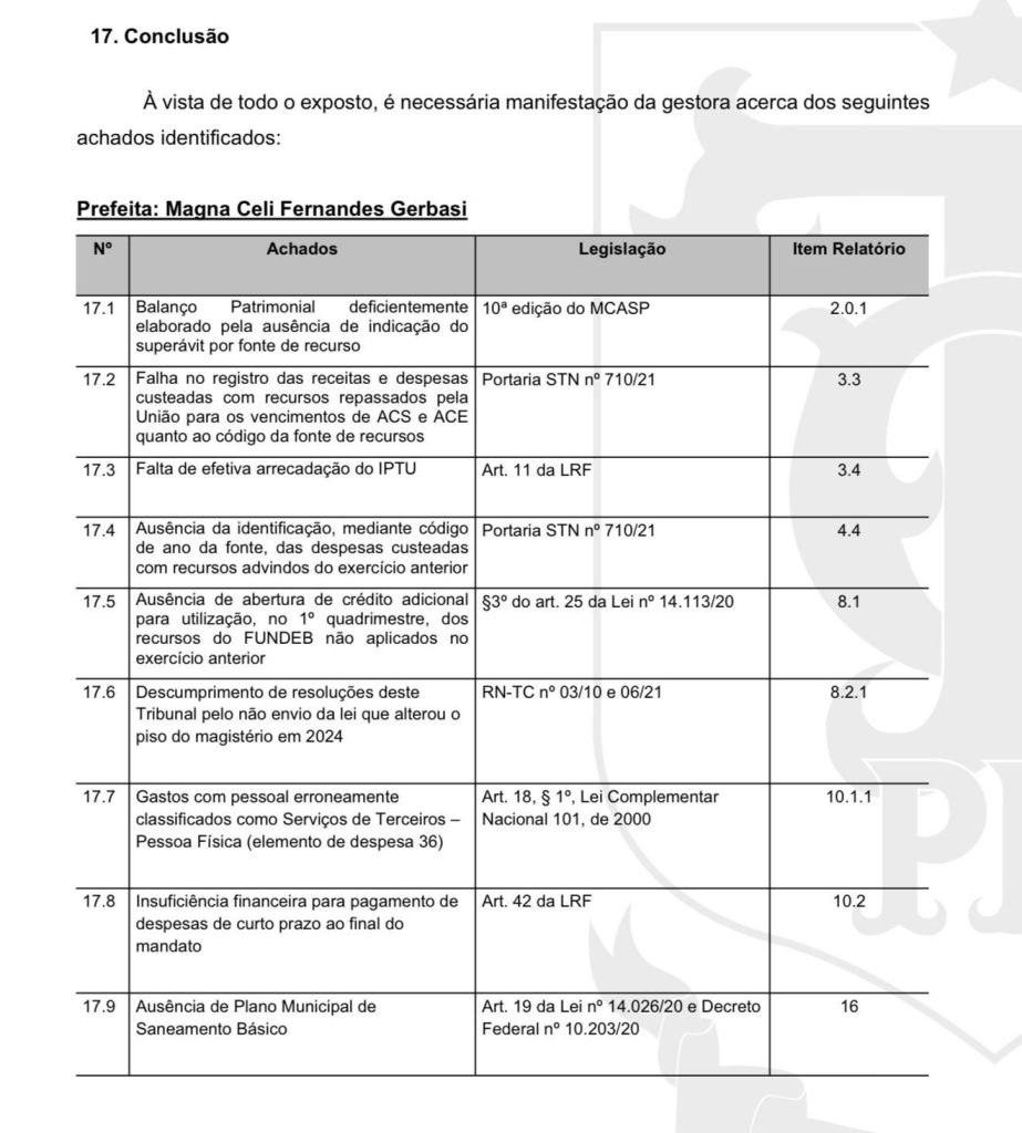 O Tribunal de Contas solicitou que a prefeita Magna Gerbasi apresente esclarecimentos sobre os pontos listados antes da emissão do parecer prévio definitivo sobre as contas de 2024.