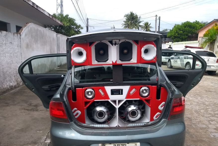 A guarnição retornou a local e flagrou o suspeito com o sistema de som ligado em volume altíssimo. O veículo onde estava instalado o sistema de som foi identificado como CRLV em atraso.