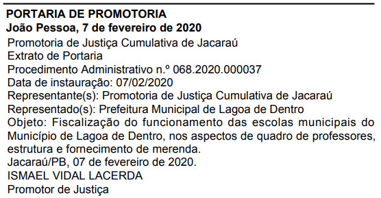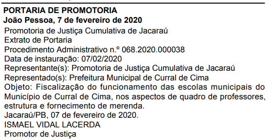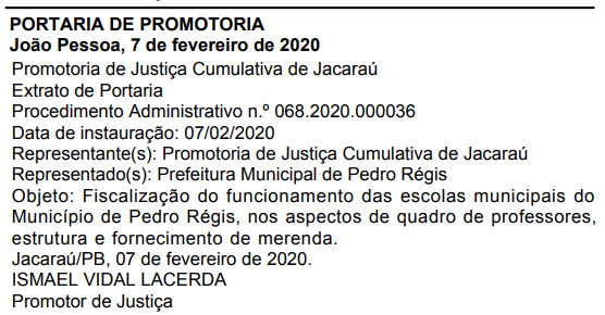 As escolas municipais das cidades de Jacaraú, Pedro Régis, Lagoa de Dentro e Curral de Cima irão passar por fiscalizações. É o que determinou o promotor de Justiça, Ismael Vidal Lacerda, ao ordenar a abertura de procedimento administrativo para investigar as condições de funcionamento das instituições de ensino.