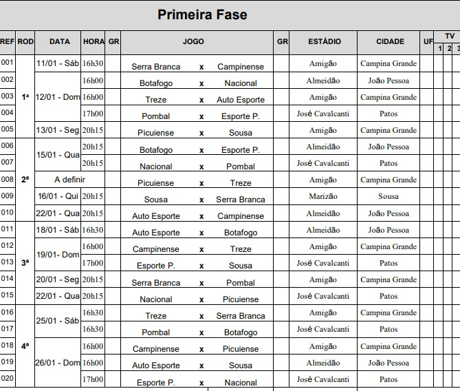 A Federação Paraibana de Futebol divulgou, nesta quinta-feira (26), a tabela detalhada das quatro primeiras rodadas do Campeonato Paraibano 2025. A competição inicia no dia 11 de janeiro, com o confronto entre Serra Branca e Campinense.