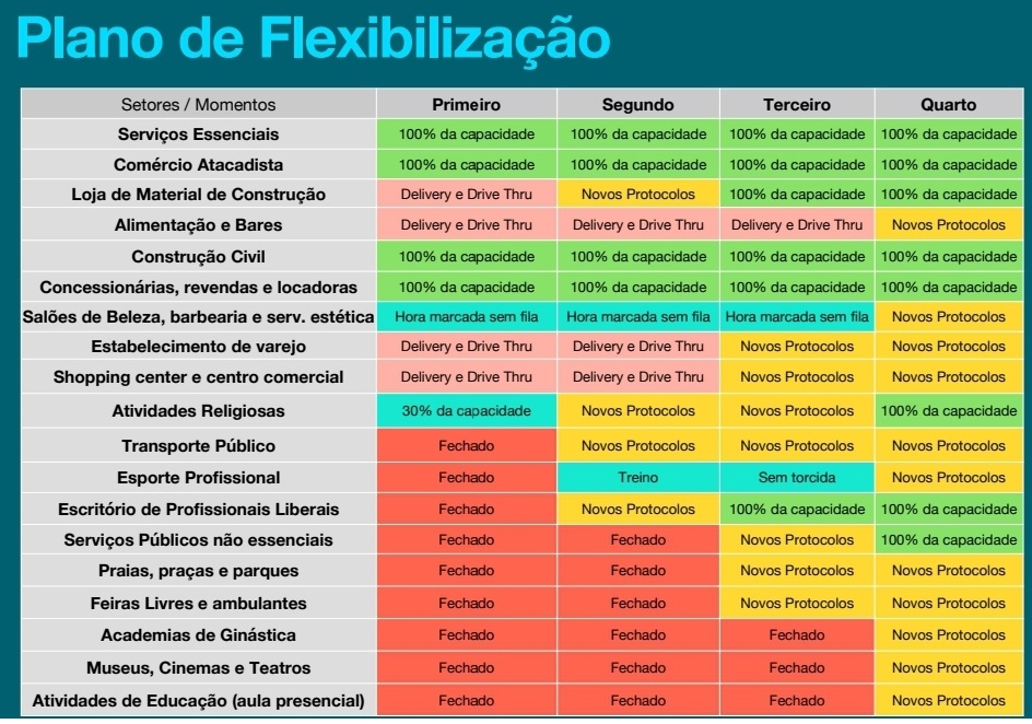 O Plano Estratégico teve início em 15 de junho, após o fim do isolamento social rígido, com ações planejadas e regras de ouro para garantir a segurança da população e evolução da cidade no enfrentamento à pandemia. Entre elas, o distanciamento social, ou seja, 1,5m de distância entre funcionários e clientes, priorização do trabalho remoto para colaboradores de risco e demarcação de espaço nas filas, além de medidas de higiene como disponibilização do álcool 70% e uso obrigatório de máscaras. Na primeira etapa, retornaram à atividade segmentos como o comércio atacadista, a construção civil, concessionárias, revendas de veículos e locadoras, e empresas de assistência técnica, além de atividades religiosas com 30% da capacidade.