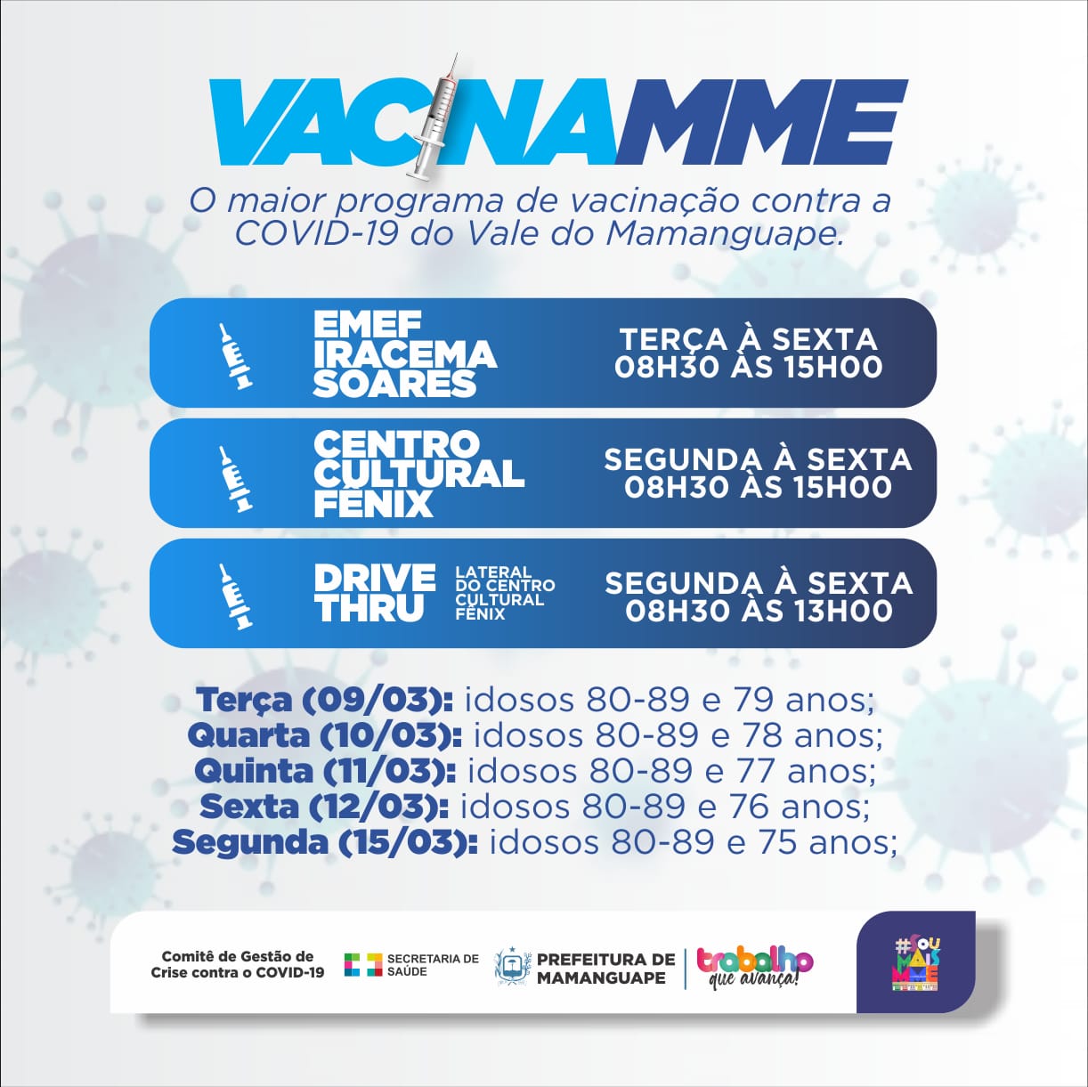 A ampliação da vacinação para os grupos prioritários ocorre graças ao recebimento de novas doses da vacina pelo município. No ato da vacinação será preciso apresentar um documento de identificação com foto, CPF, Cartão de Vacinação e comprovante de residência no município de Mamanguape.