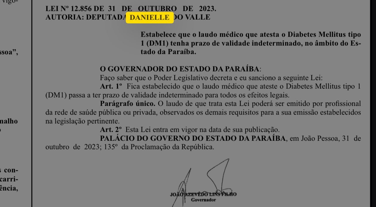 O Diário Oficial do Estado (DOE) trouxe nesta quarta-feira (1º), a publicação de uma nova lei que garante laudo médico que atesta o diabetes tipo 1 (diabete mellitus) passe a ter prazo de validade indeterminado, no âmbito do estado da Paraíba.