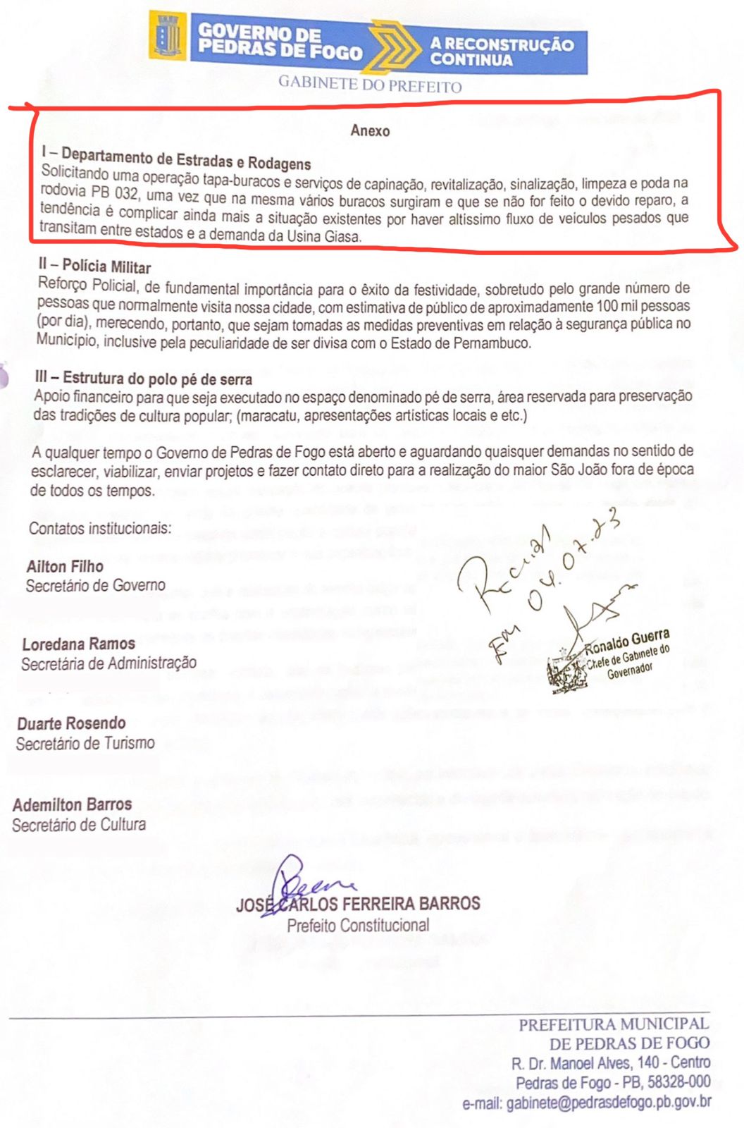 Veja documento da prefeitura de Pedras de Fogo assinado pelo chefe de gabinete do governador