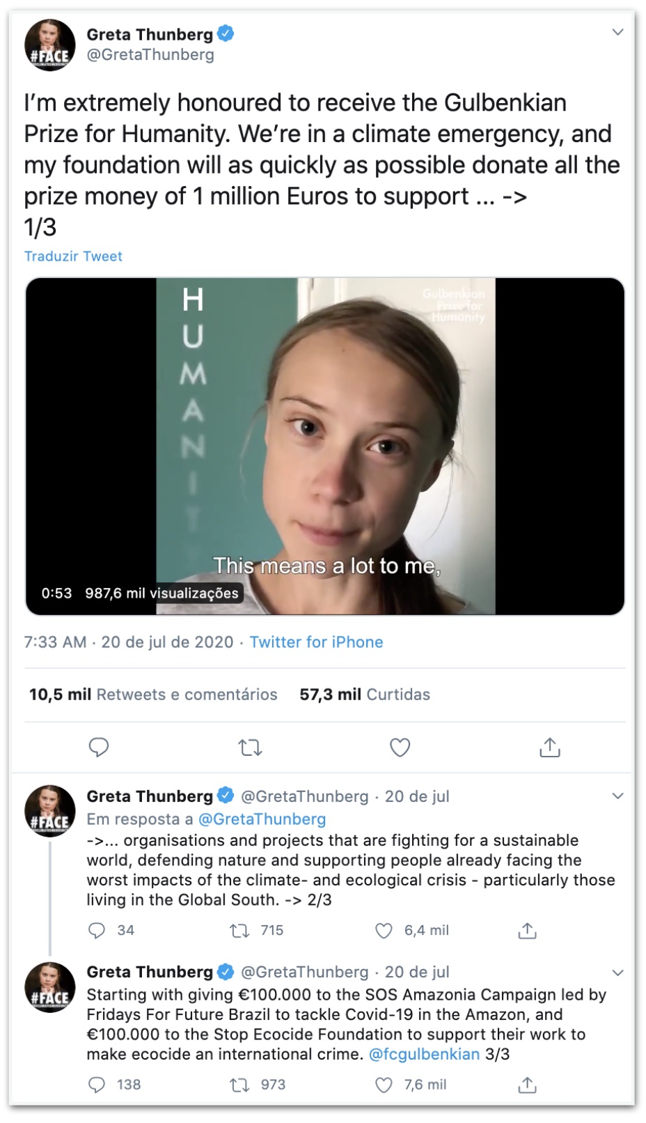 “Todo o prêmio em dinheiro será doado pela minha fundação a diferentes organizações e projetos que trabalham para ajudar pessoas na linha de frente afetadas pelas crises climática e ecológica, principalmente no Sul Global”, afirmou Greta, em vídeo.