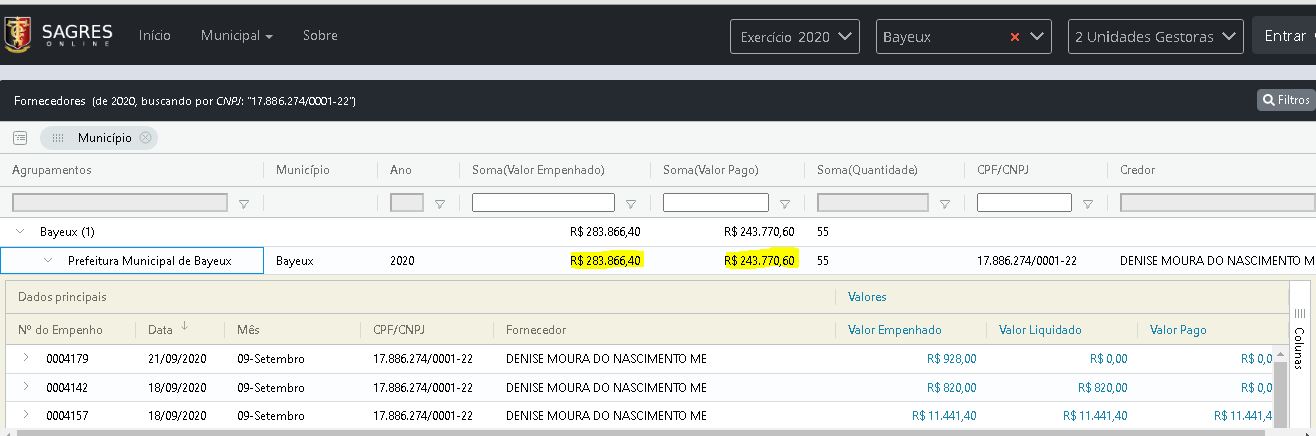 A Associação Dos Agricultores da Cidade de Bayeux (CNPJ: 19.461.762/0001-13) já recebeu até o momento quase R$170 mil em valores empenhados com a prefeitura. O contrato com a prefeitura prevê o pagamento pelo fornecimento de alimentos oriundos da agricultura familiar para a merenda escolar. Segundo a denúncia de populares, o pagamento é em vão, por que os insumos não chegam ao devido destino.