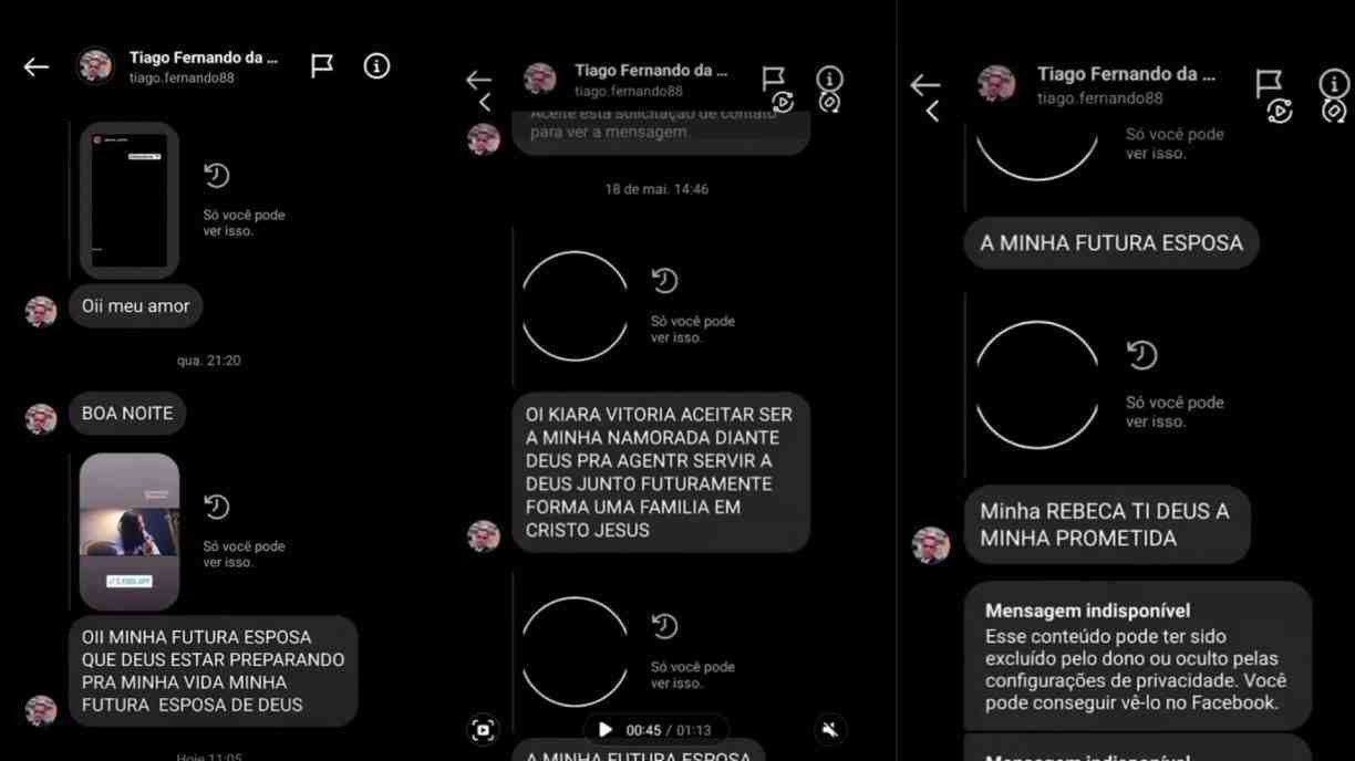 “Oii minha futura esposa que Deus está preparando pra minha vida, minha futura esposa de Deus”, escreveu em uma mensagem. “Oi Kiara Vitória, aceita ser a minha namorada diante de Deus para servir a Deus juntos e futuramente formar uma família em Cristo Jesus”, diz outra.