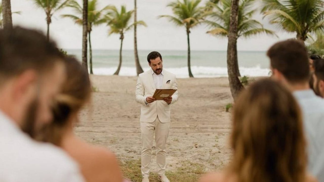 Os vídeos do evento, realizado em um resort em Itacaré, na Bahia, viralizaram nas redes sociais esta semana. Em meio a paisagem paradisíaca, a ausência do noivo e o discurso do médico chamaram a atenção dos internautas.