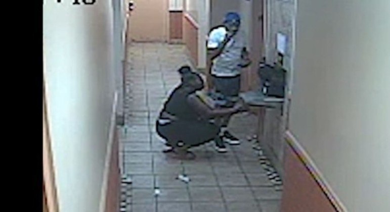 Uma câmera de segurança gravou o momento em que o homem entra na lixeira lentamente, até cair e não ser mais visto.