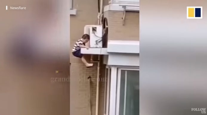 Um homem foi saudado como herói ao agarrar um menino, de 2 anos, que caiu do quinto andar de um prédio em Huai’an, província de Jiangsu, na China, após ter sido deixado sozinho em casa.