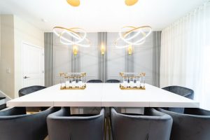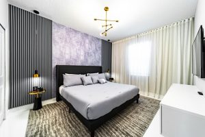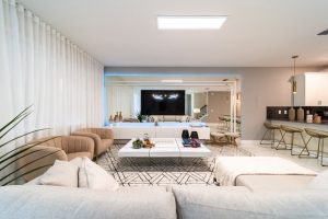 Alguns dos quartos foram pensados para criar experiências dignas dos parques temáticos que são tão característicos da Flórida. Já a suíte master do casal ganhou painel de porcelanato e cores neutras. A garagem é outro destaque do projeto: o teto do ambiente recebeu pintura especial e se tornou um campo de futebol. Ali coube mesa oficial de bilhar, camisas da seleção brasileira, fotos de Hulk em campo, pebolim e fliperama. Uma casa de férias onde a diversão está sempre garantida.