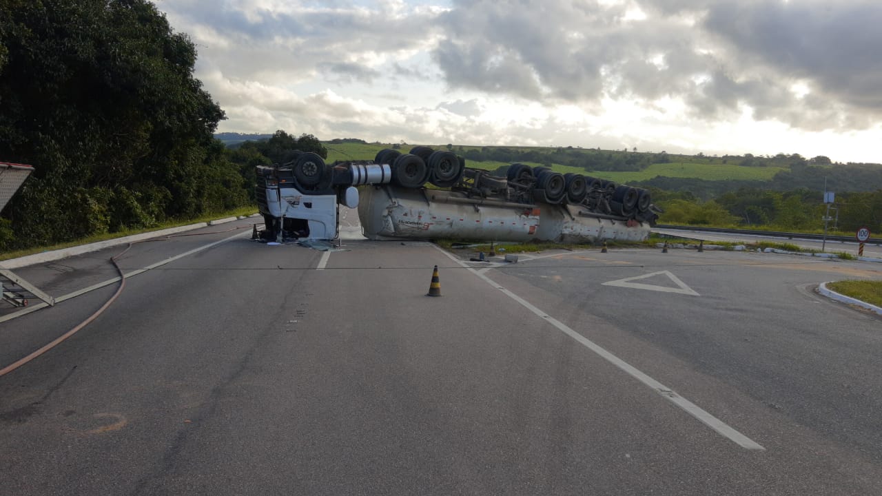 Os esforços são para evitar que o combustível, que vazou após o veículo tombar ao desviar de outro acidente, chegue a um dos rios da região.