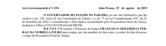 O Diário Oficial do Estado desta quinta-feira (8) traz a recondução de Francisco Seráphico da Nóbrega Filho ao cargo de promotor-geral de Justiça.