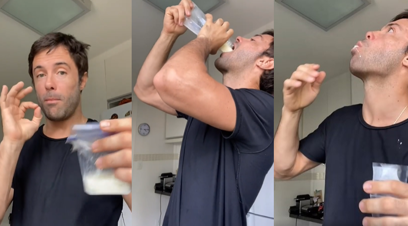 “Eu estava pesquisando na internet que o melhor alimento é o leite materno. Nada como prová-lo”, diz ele enquanto pega um saquinho do leite. Logo em seguida ele prova e conta que o gosto não é tão ruim.