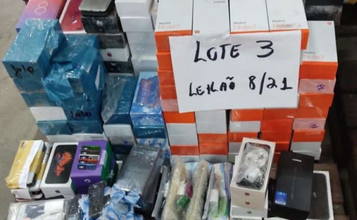 O lote 3, por exemplo, com mais de 800 itens, tem celulares e smartwatches das marcas iPhone e Xiaomi. O lance inicial é de R$ 251.500.