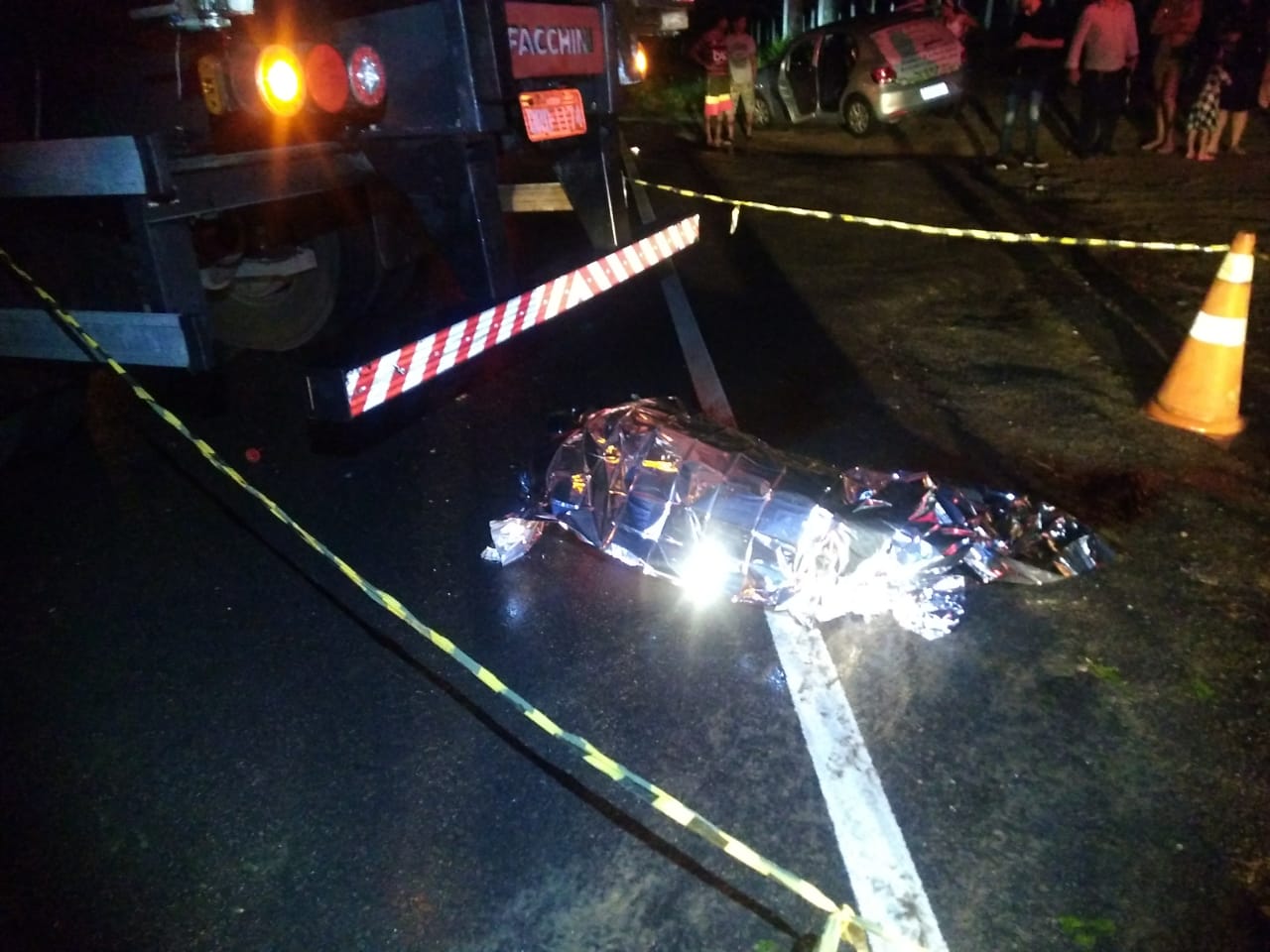 Como o local é escuro e sem sinalização, o motociclista vinha e em seguida colidiu na traseira do caminhão vindo a óbito no local.