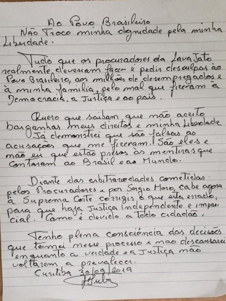 — Não troco minha dignidade pela minha liberdade. Tudo que os procuradores devem fazer é pedir desculpa ao povo brasileiro, à minha família — afirmou Lula, na carta lida na frente da Superintendência da Polícia Federal do Paraná.
