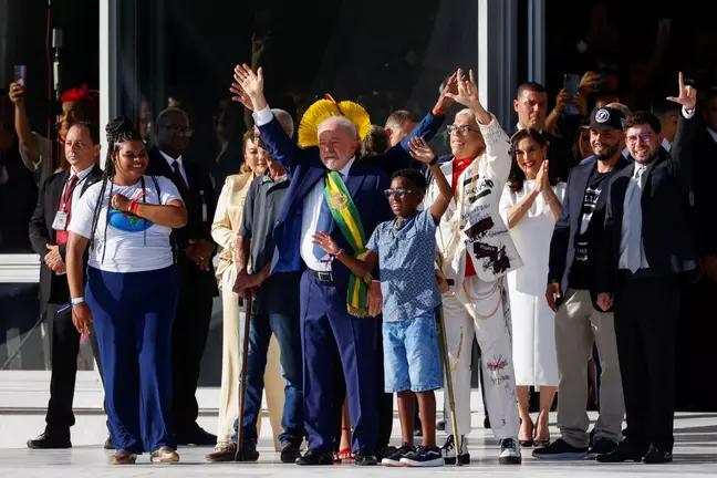 Ao lado de Janja, que carregava em seu colo a cadela vira-lata Resistência e do vice-presidente Geraldo Alckmin (PSDB) e sua esposa, Lu Alckmin, Lula subiu a rampa acompanhado de diversas pessoas representando a diversidade da população brasileira.