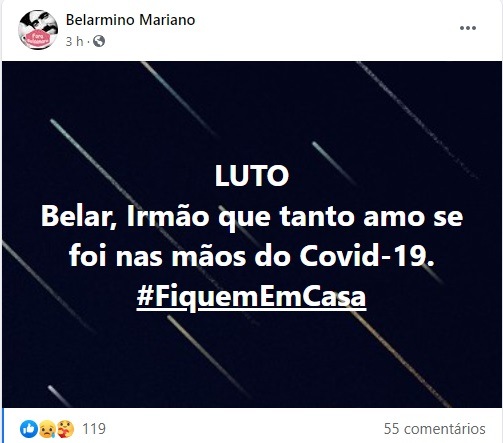 Família – A morte de José Belarmino, o Belar, foi lamentada por seus irmãos. Dois deles, Joana Belarmino e Belarmino Mariano, professor e ex-candidato a prefeito de Guarabira, deixaram mensagens emocionadas em suas redes sociais: