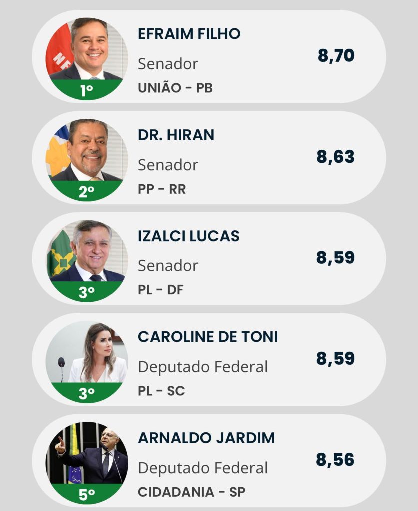 Efraim obteve a maior nota, até agora, 8,70. Ele tirou 10 na avaliação de votações sobre antiprivilégios e 7,96 nas análises relacionadas ao antidesperdício como presenças e economia de verbas. Além disso, no tema anticorrupção e processos, o parlamentar paraibano não possui condenações judiciais.
