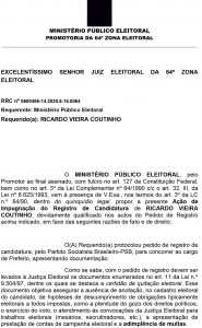 Na tarde desta sexta-feira (25) o Ministério Público da Paraíba solicitou que a candidatura do ex-governador Ricardo Coutinho à Prefeitura Municipal de João Pessoa fosse impugnada. O órgão argumentou junto ao Triunal Regional Eleitoral da Paraíba (TRE-PB) que Coutinho estaria inadimplente em relação ao pagamento de multa à Justiça Eleitoral por ausência em votação.