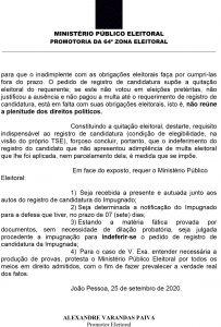 O requerimento do MPPB foi assinado pelo promotor eleitoral Alexandre Varandas Paiva defende que uma certidão emitida pelo Cartório Eleitoral não possuiria quitação eleitoral por conta do não teria sido paga e que a mesma informação estaria disponível no site do TRE-PB. Leia a íntegra do requerimento do MPPB abaixo:
