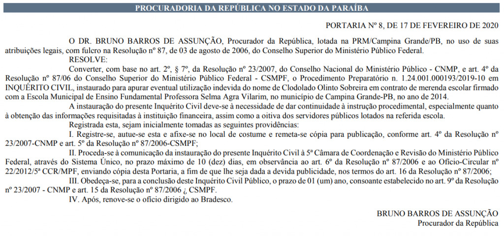 O procedimento foi tornado público na edição desta terça-feira (18) do Diário Oficial do MPF na Paraíba. A portaria que instaura a investigação é assinada pelo procurador Bruno Barros de Assunção. Confira o extrato: