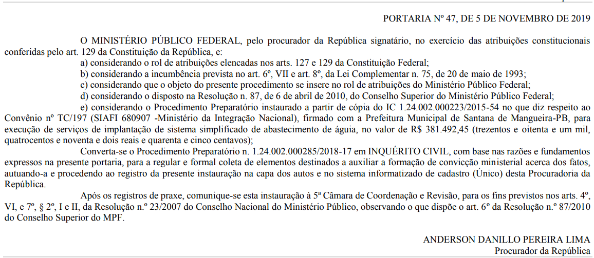 O Ministério Público Federal (MPF) instaurou Procedimento Preparatório para investigar irregularidades em um convênio firmado com a Prefeitura Municipal de Santana de Mangueira, na Paraíba, para a implantação de sistema simplificado de abastecimento de água. De acordo com o extrato da investigação, publicado nesta terça-feira (19) no Diário do MPF, o valor da execução dos serviços chega a quase R$ 400 mil. Veja: