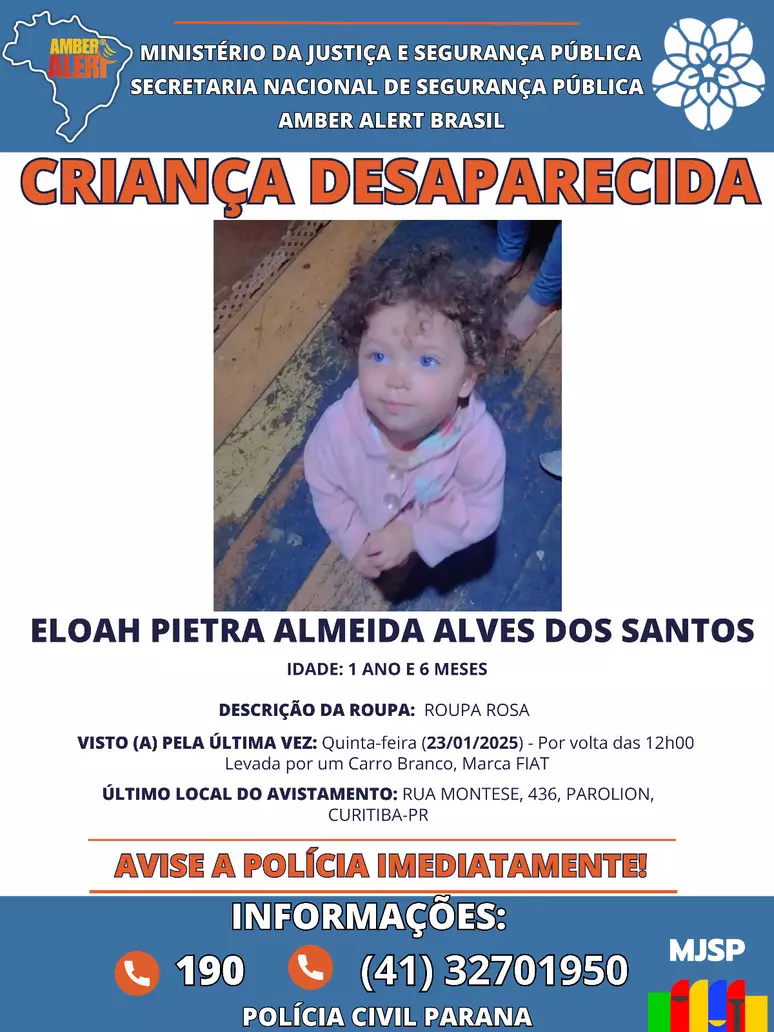 A pequena Eloah Pietra Almeida Santos, de 1 ano e 7 meses, foi sequestrada por uma mulher que disse ser agente de saúde em Curitiba, na tarde de quinta-feira, 23. De acordo com a mãe da criança, a suspeita a convenceu a entrar em um carro, alegando que precisaria levá-la para realizar exames médicos.