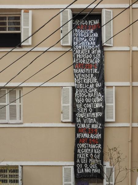 “Um lado meu pensa que não podem me invadir assim e minha intenção é de continuar com a rotina normalmente. Por outro lado, na prática, as imagens me desestruturaram muito e não consigo deixar de pensar na possibilidade de que alguém está me observando. Por isso decidi produzir uma faixa, com a ajuda de artistas plásticos, a fim de alertar os envolvidos sobre os crimes que cometeram.” Enquanto a investigação segue, a faixa está pendurada na sua janela.