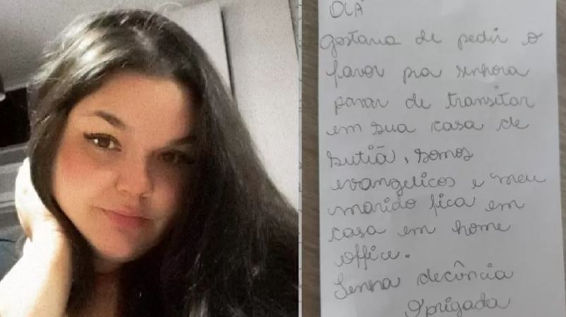 A confeiteira Juliana Kulpa, de 25 anos, foi pega de surpresa ao abrir a caixa de correspondências de seu apartamento e encontrar um bilhete de uma vizinha, que pedia para que ela parasse de transitar em sua própria residência usando apenas sutiã. “Somos evangélicos e meu marido fica em casa em home office. Tenha decência”, diz a mensagem. O caso ocorreu em Osasco, na Grande São Paulo, há cerca de 20 dias e vem pautando debate — e gerando indignação — nas redes sociais.