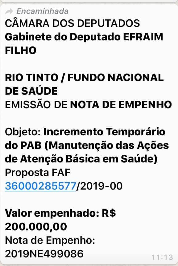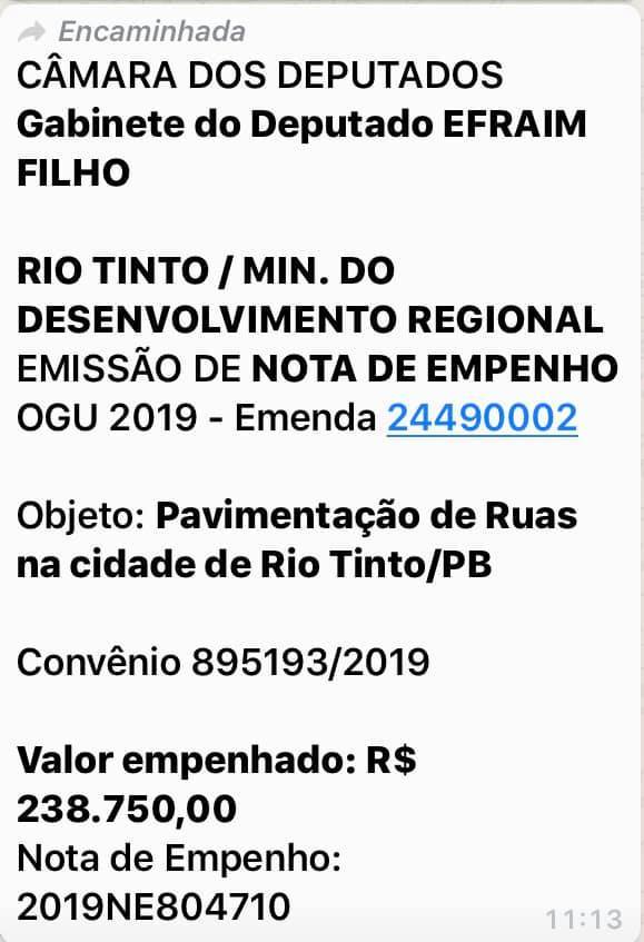 “Muito bom poder receber a confirmação do deputado Efraim Filho (DEM) de emendas para Rio Tinto em áreas tão importantes. Reafirmo que mesmo não tendo votado no deputado na eleição passada, hoje, tivemos a grata satisfação de recebermos um recurso da ordem de R$ 899.565.800 mil reais, para aquisição de ambulância, calçamentos e investimentos na atenção básica da saúde do nosso município. Nosso compromisso será sempre com anseios e benefícios que atenda nossa população”, declarou Fernando Naia.