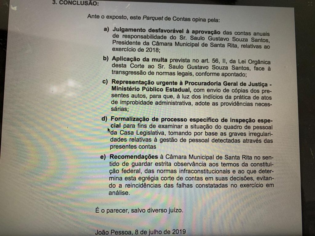 Os autores da denúncia afirmaram, à época, que a Câmara de Santa Rita, no começo de 2017, elegeu no mesmo dia as Mesas Diretoras que comandariam a Casa nos biênios 2017/2018 e 2019/2020. Para o primeiro, a escolhida foi a chapa encabeçada por Saulo e para o segundo, a do vereador Anésio Miranda (PSB). No entanto, em maio do mesmo ano a eleição do biênio 2019/2020 foi anulada e uma nova foi feita, com Saulo Gustavo sendo eleito para mais dois anos.