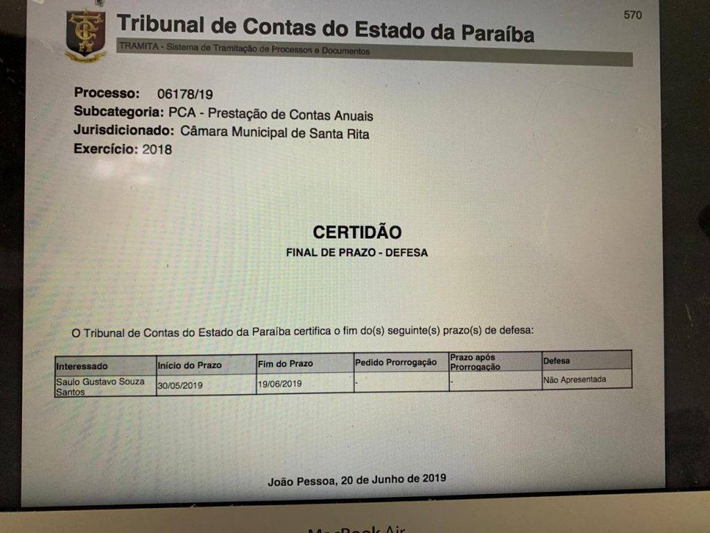 No registro de Prestação de Contas Anuais (06178/19) do TCE, Gustavo Santos foi intimado para defesa no dia 30/05/2019, o prazo final para comparecimento foi 19/06/2019, mas o vereador não quis se defender das acusações e não foi prestar os devidos esclarecimentos à Corte.