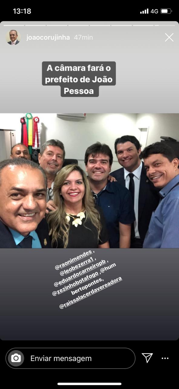 O presidente da Câmara de João Pessoa, João Corujinha (DC), alfinetou o prefeito de João Pessoa, Luciano Cartaxo (PV), ao postar nas redes sociais uma foto com o ex- vereador Raoni Mendes, o deputado Eduardo Carneiro e outros parlamentares com a seguinte legenda: “a Câmara fará o prefeito de João Pessoa”.