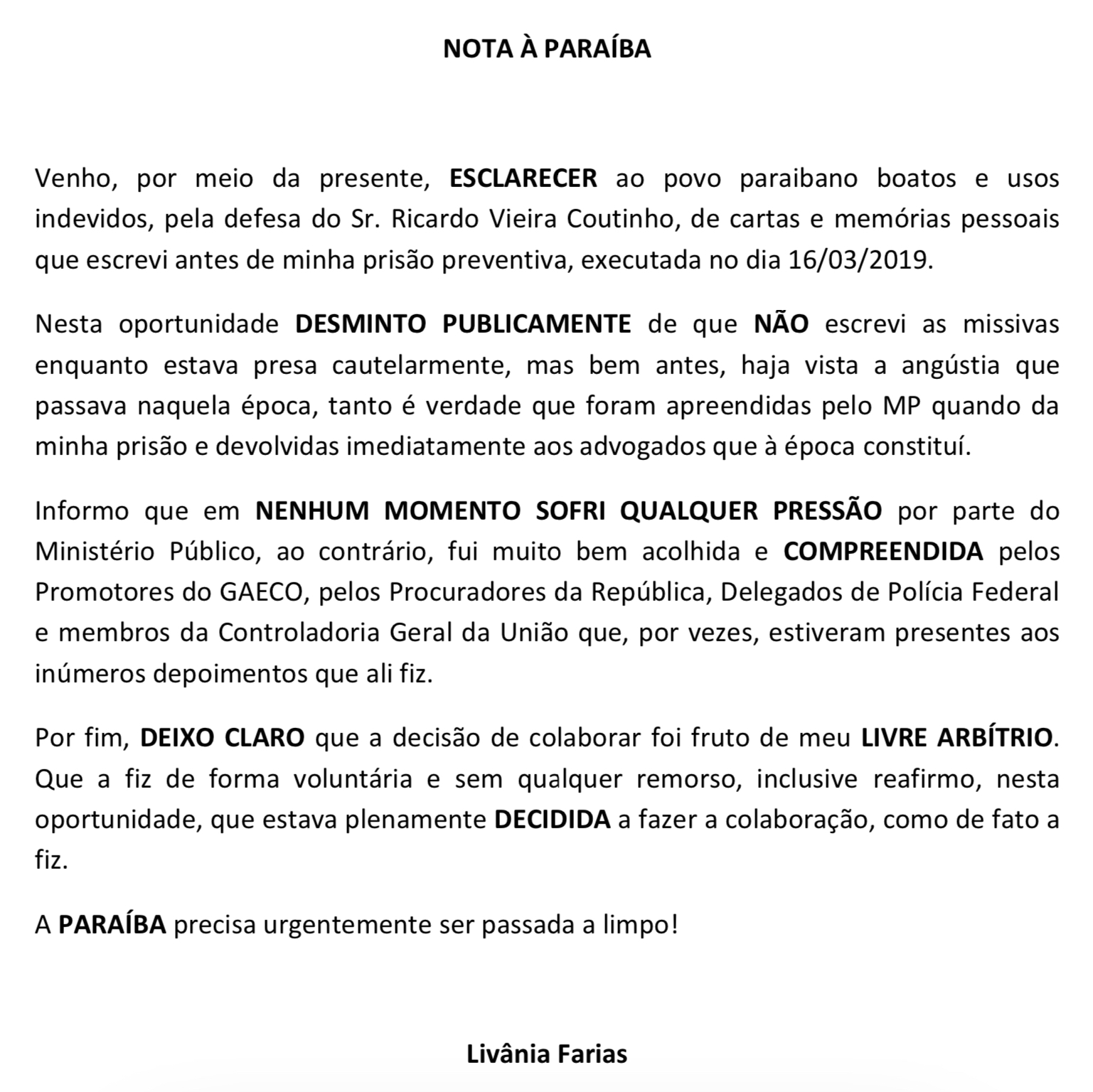 Entre as citações estariam cartas assinadas pela secretária nas quais ela teria feito planos, inclusive, para o próprio funeral. Livânia, na nota, não nega que tenha escrito as “missivas”, mas assegura que elas foram redigidas antes da prisão, quando temia o avanço das investigações da operação Calvário. Elas foram apreendidas, inclusive, durante operação do Gaeco e devolvidas em seguida. A ex-secretária garante que a decisão de delatar foi fruto do livre arbítrio dela.