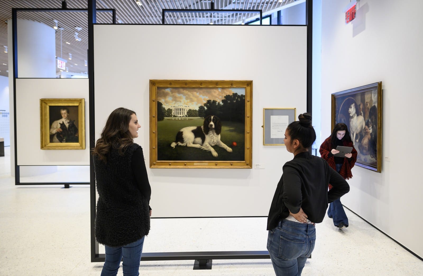Entre aqueles no centro das atenções, os fiéis companheiros dos presidentes americanos. Como a pintura de “Millie”, a springer spaniel inglesa de George e Barbara Bush.
