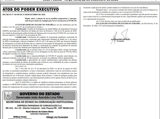 Conforme apurou o ClickPB, o decreto diz que “nos dias 24, 25 e 31 de dezembro de 2020 e no dia 01 de janeiro de 2021 em todos os municípios paraibanos, os bares, restaurantes, lanchonetes, lojas de conveniência, praças de alimentação e estabelecimentos similares somente poderão funcionar com atendimento nas suas dependências até 15:00 horas, ficando vedada depois desse horário a venda de qualquer produto para consumo no próprio estabelecimento, cujo funcionamento poderá ocorrer apenas através de delivery ou para retirada pelos próprios clientes (takeaway).”
