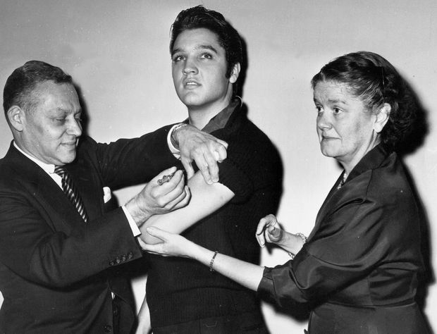 No dia 28 de outubro de 1956, Elvis Presley chegou para salvar o dia. O astro subiu no palco do The Ed Sullivan Show, o programa de televisão mais popular dos EUA naquela época. Lá, ele cantou sucessos como “Love Me Tender” e “Hound Dog”. Mas, antes disso, cumpriu um pedido da March of Dimes (antiga Fundação Nacional para a Paralisia Infantil). O cantor, que tinha 21 anos, posou para as câmeras enquanto recebia a vacina contra a poliomielite.