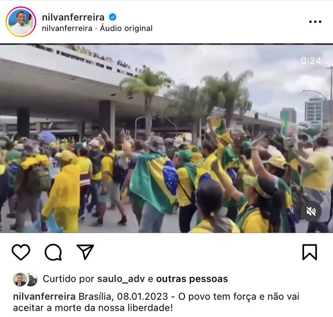 “Brasília, 08.01.2023 – O povo tem força e não vai aceitar a morte da nossa liberdade!”, escreveu Nilvan na legenda da publicação que foi deletada. O post era acompanhado de um vídeo dos atos criminosos.