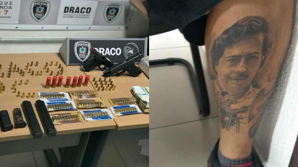 Quatro pessoas foram presas suspeitas de tráfico de drogas, armas e munições na terça-feira (9), em João Pessoa. De acordo com a Polícia Civil, um dos suspeitos presos se intitulava como o “Pablo Escobar de João Pessoa”, e tinha tatuagens do narcotraficante colombiano no corpo.