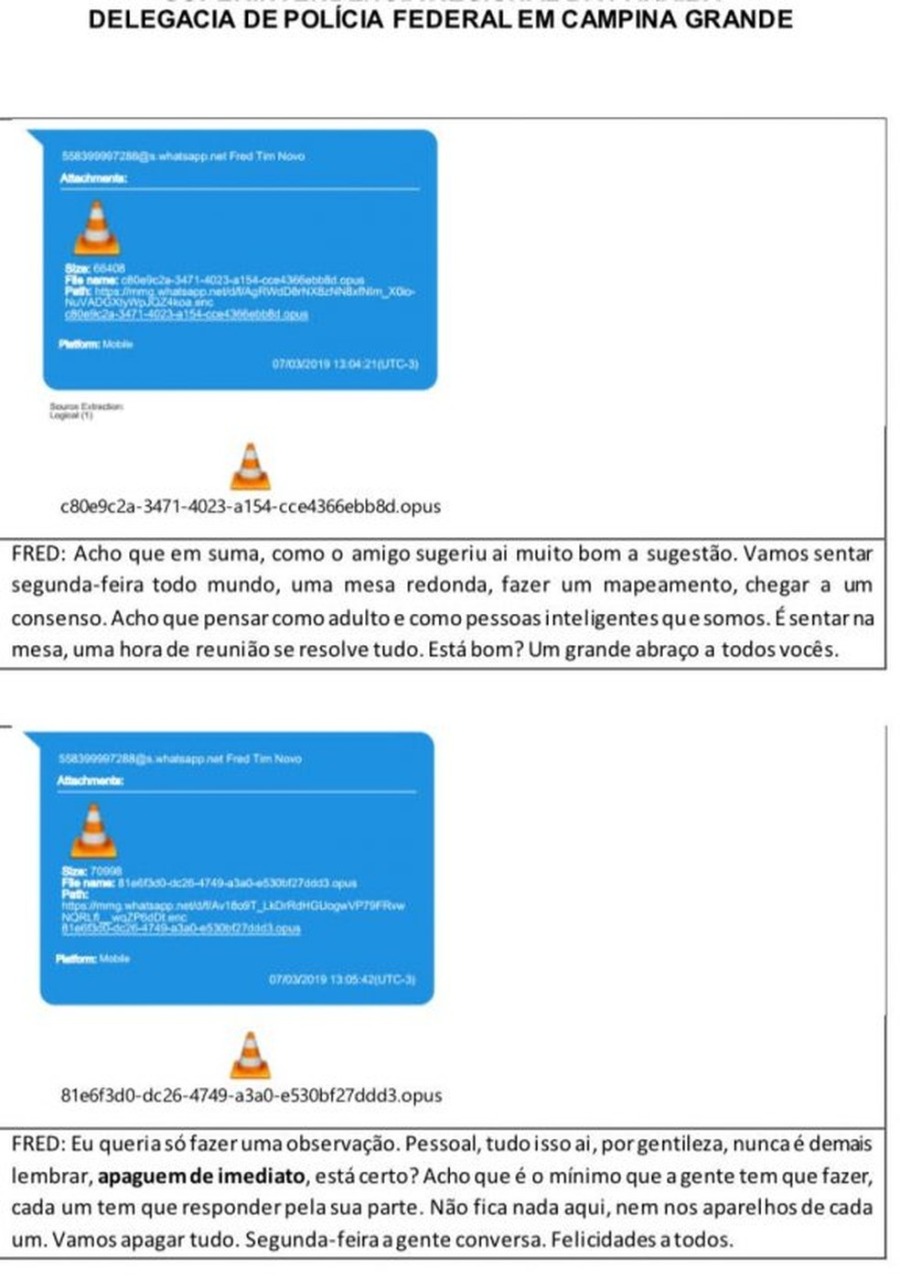 Segundo o documento, o grupo no aplicativo de mensagens foi criado no dia 13 de dezembro de 2018, às 7h40, por Marco Antônio Querino. Mas o primeiro diálogo captado pelos investigadores tem a data de 19 de fevereiro deste ano. Ainda conforme o relatório, estavam como membros do grupo no WhatsApp os empresários Flávio Souza Maia, Marco Antônio Querino da Silva, Severino Roberto Maia de Miranda, o vereador Renan Maracajá, Frederico de Brito Lira, Angelo Felizardo e Azuilo Santana de Araújo Filho, além de uma outra pessoa não identificada pelos policiais.