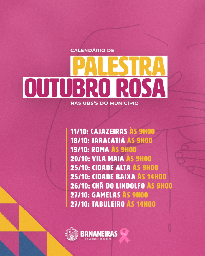 Com celebração anual e com o objetivo de ampliar o compartilhamento de informações, a Coordenação da Atenção Básica Municipal planejou promoção de palestras que integra a etapa de conscientização sobre Câncer de Mama, cujo objetivo principal dos momentos serão falas sobre como ocorrem o diagnóstico e tratamento.