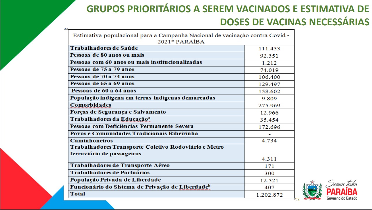 O governo da Paraíba pretende vacinar cerca de 1,2 milhão de pessoas de grupos prioritários em 2021. O estado seguirá a ordem definida no Plano de Imunização. A meta é vacinar pelo menos 95% das pessoas.
