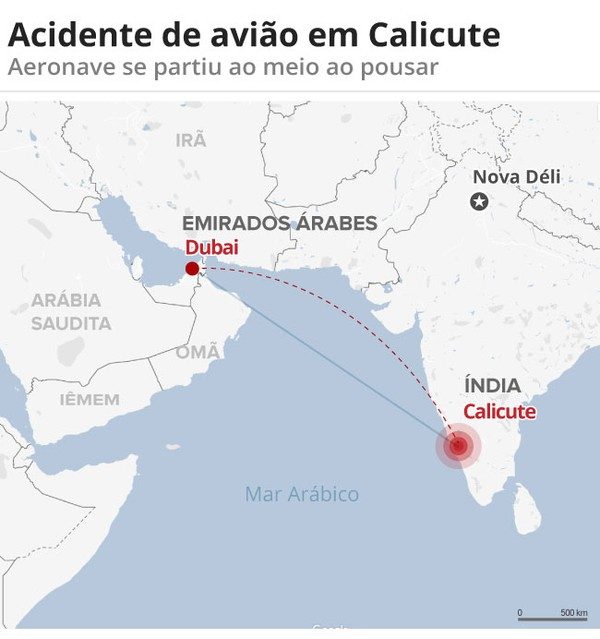 A aeronave que saiu de Dubai, nos Emirados Árabes, ultrapassou a pista e caiu em um barranco após perder a pista de pouso. Imagens feitas no local mostraram que a fuselagem da aeronave se partiu em dois com o impacto.