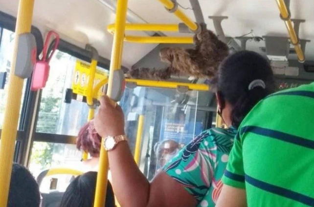 Pendurado nas barras de ferro dentro do ônibus, o animalzinho se tornou a atração da viagem. Algumas fotos do novo passageiro viralizaram.