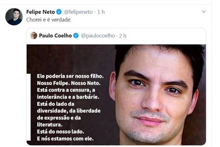 Um dos escritores brasileiros mais vendidos do mundo, Paulo Coelho manifestou publicamente seu apoio a Felipe Neto, depois que o youtuber falou das ameaças que vem sofrendo. Felipe contou que precisou até tirar a mãe do país como forma de proteção.